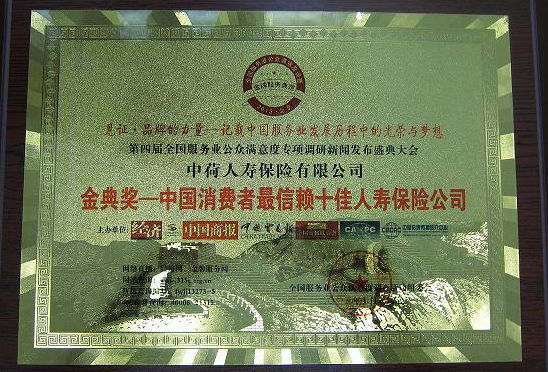 2013年10月26日至27日,“金典奖—全国服务业公众满意度专项调研揭晓新闻发布盛典大会”在北京人民大会堂举行。中荷人寿在此次盛典中,荣获“中国消费者最信赖十佳人寿保险公司”及“中国最具社会责任企业公民”两项大奖。