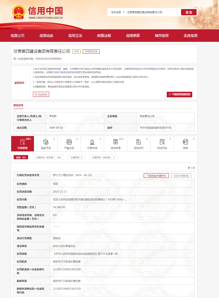 近日,信用中国公示了甘肃第四建设集团有限责任公司的行政处罚决定。行政处罚决定书文号苏宁江宁建执罚决﹝2025﹞20-1号显示,甘肃第四建设集团有限责任公司违法事实为投标人相互串通投标。