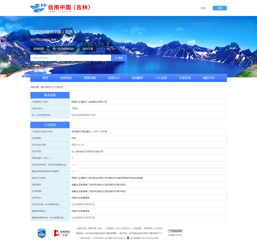 对此,处罚机关对珲春矿业八连城煤业的上述违法行为,作出处人民币叁万元罚款的行政处罚。行政处罚决定书文号:吉(珲春市)煤监管立﹝2025﹞001号。