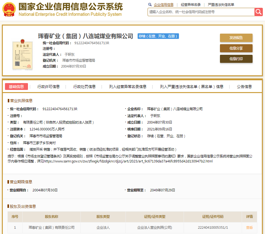 国家企业信用信息公示系统显示,珲春矿业(集团)八连城煤业有限公司成立于2004年,注册资本12346万元人民币,法定代表人于跃东,由吉林能投集团子公司——珲春矿业(集团)有限责任公司全资持股。