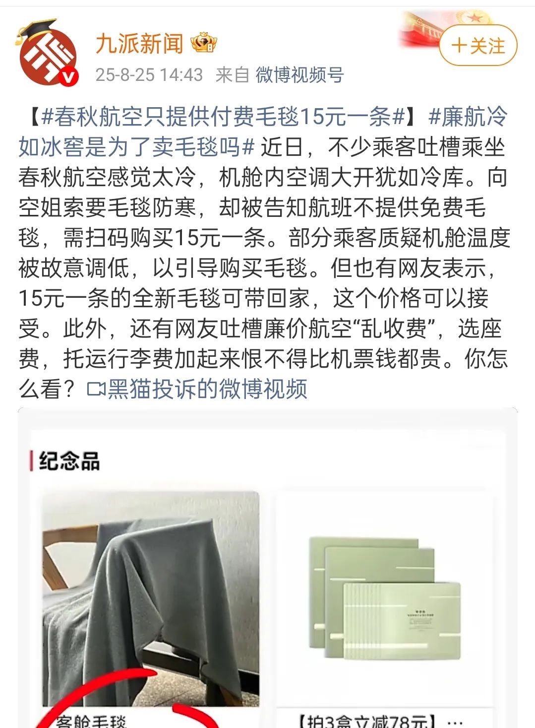 部分乘客质疑机舱温度被故意调低,以引导购买毛毯。但也有网友表示,15元一条的全新毛毯可带回家,这个价格可以接受。